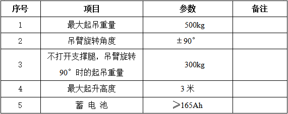 2.1.2整車電動(dòng)驅(qū)動(dòng), 吊臂可旋轉(zhuǎn);在吊臂根部(吊臂不旋轉(zhuǎn))能吊500KG;兩側(cè)支撐腿不打開,吊臂旋轉(zhuǎn)90°,能吊300KG。