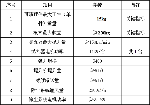 2.2功能、結(jié)構(gòu)須滿足如下要求:該設(shè)備主要由吊鉤輸送系統(tǒng)、清理室體、拋丸器、提升機、維修平臺、分離器、螺旋輸送器、底部料斗、除塵系統(tǒng)、電控系統(tǒng)等組成。