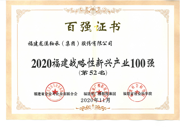 2020年11月20日,2020福建企業(yè)100強(qiáng)發(fā)布大會暨福建企業(yè)家大講壇在寧德市舉辦。會上,福建省企業(yè)與企業(yè)家聯(lián)合會聯(lián)合、福建省社會科學(xué)院、福建省廣播影視集團(tuán)聯(lián)合發(fā)布的“2020福建戰(zhàn)略性新興產(chǎn)業(yè)領(lǐng)軍企業(yè)100強(qiáng)”榜單中,福建龍溪軸承(集團(tuán))股份有限公司位列榜單第52名。