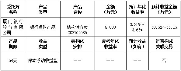 本次委托理財金額:委托廈門銀行理財8,000萬元。