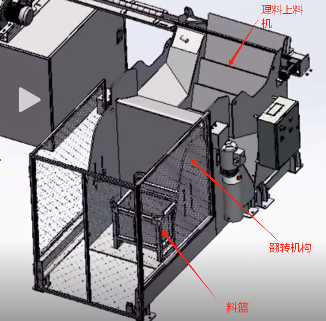 1.1上料:實(shí)現(xiàn)整籃上料,翻轉(zhuǎn)機(jī)構(gòu)將料籃翻轉(zhuǎn),物料間歇式倒入理料機(jī)(料籃翻轉(zhuǎn)角度可控),理料機(jī)自動理料,有序送料至雙端面磨床進(jìn)料料道。