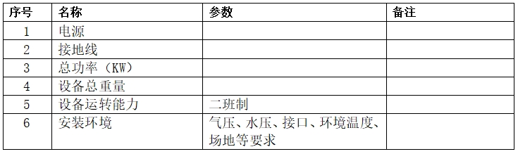 3.設(shè)備其他技術(shù)指標(biāo):(需含設(shè)備總功率、電壓、電流、氣壓、水壓、接口、環(huán)境溫度、場地等安裝環(huán)境有關(guān)要求)