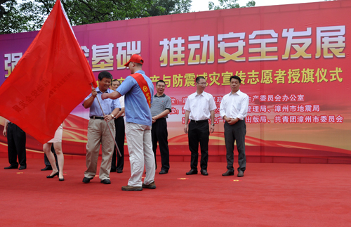 今年5月份是全市第二個防震減災(zāi)宣傳月,6月份是全國第十二個“安全生產(chǎn)月”。6月13日上午,公司黨委副書記張?zhí)┥鷰ьI(lǐng)15名安全生產(chǎn)志愿者代表國資系統(tǒng)參加漳州市2013年安全生產(chǎn)與防震減災(zāi)宣傳志愿者授旗儀式