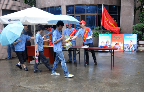 (圖b)志愿者在公司南大門,為公司員工分發(fā)安全生產(chǎn)宣傳資料。