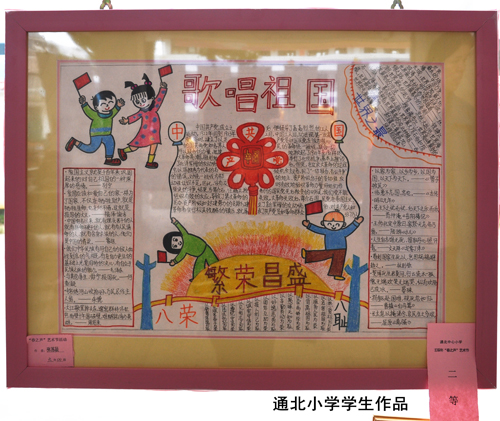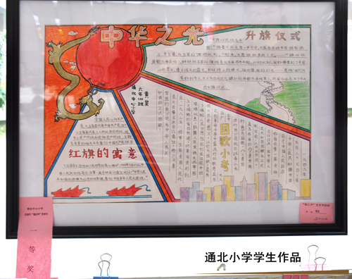 還未走進校園,就聽見清亮的童聲朗朗,操場上早成了一片歡樂的海洋,有節目演出的同學們或是忙著裝扮或是還緊張的背著臺詞、練習舞步;沒有表演節目的同學們也搬著板凳整整齊齊的坐在舞臺前面,準備為自己的小伙伴兒加油打氣兒;新搭起的藝術長廊更是吸引了眾多家長們,這里掛滿了學生們的藝術作品,有書畫作品、科技小發明、賀卡、板報……琳瑯滿目、色彩斑斕,每一幅作品都充滿了孩子們的爛漫童真和美好祝愿。